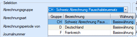 Abrechnungs-gruppe | In der Combobox stehen alle vorhandenen Abrechnungsgruppen zur Auswahl. Die Combobox weist folgende Spalten auf: Funktion: | ||||||||||||||||||||||||