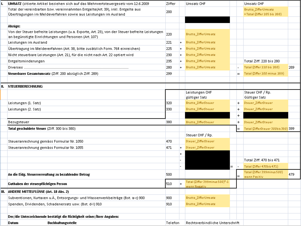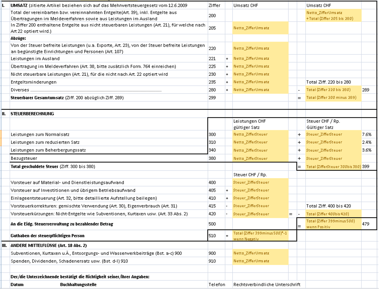 Die Berechnung der Zellen des Steuerformulars erfolgt nach folgender Methode auf Basis der Rekapitulation des Steuerjournales.