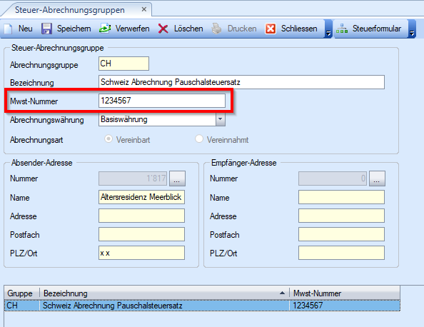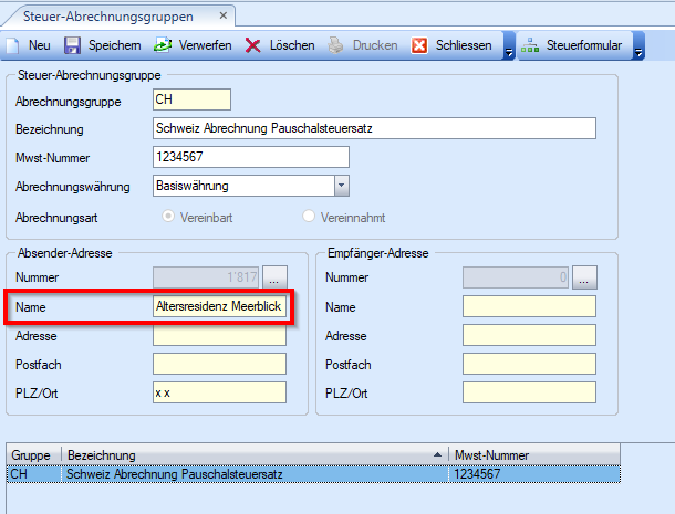 Abrechnungsformular | Formular þ Formular Das Formular wird ausgegeben ¨ Formular Das Formular wird nicht ausgegeben Mit gescanntem Formular (nur für Schweizer Formular 2010) ¨ = Im Drucker ist das Originalformular der Steuerbehörde eingelegt. Nur die Beträge sollen ausgegeben werden. þ = Im Drucker ist Blankopapier eingelegt. Es wird ein gescanntes Formular mit ausgegeben. Combobox Formular Das gültige Formulare gemäss Definition in der Steuerabrechnungsgrupp und dem selektierten Von-Daum der Abrechnungsperiode steht zur Auswahl. | ||||||||||||||||||||||||