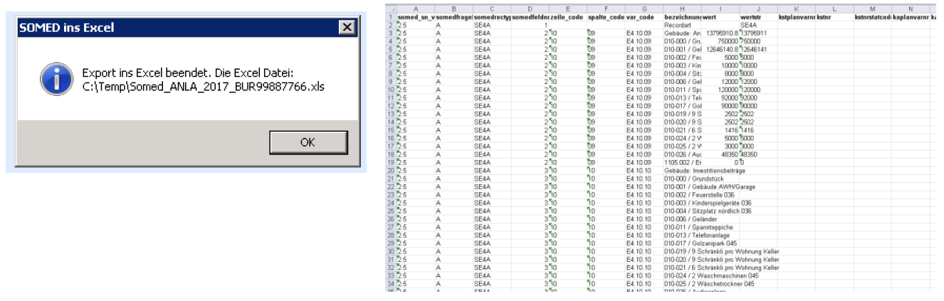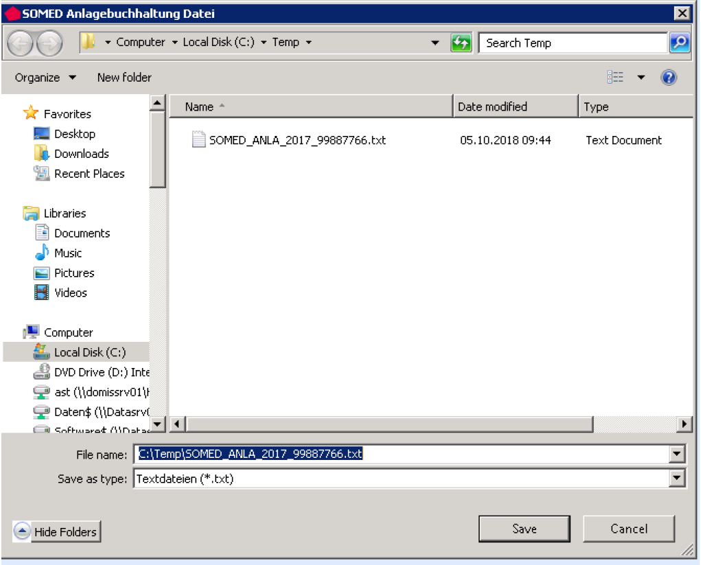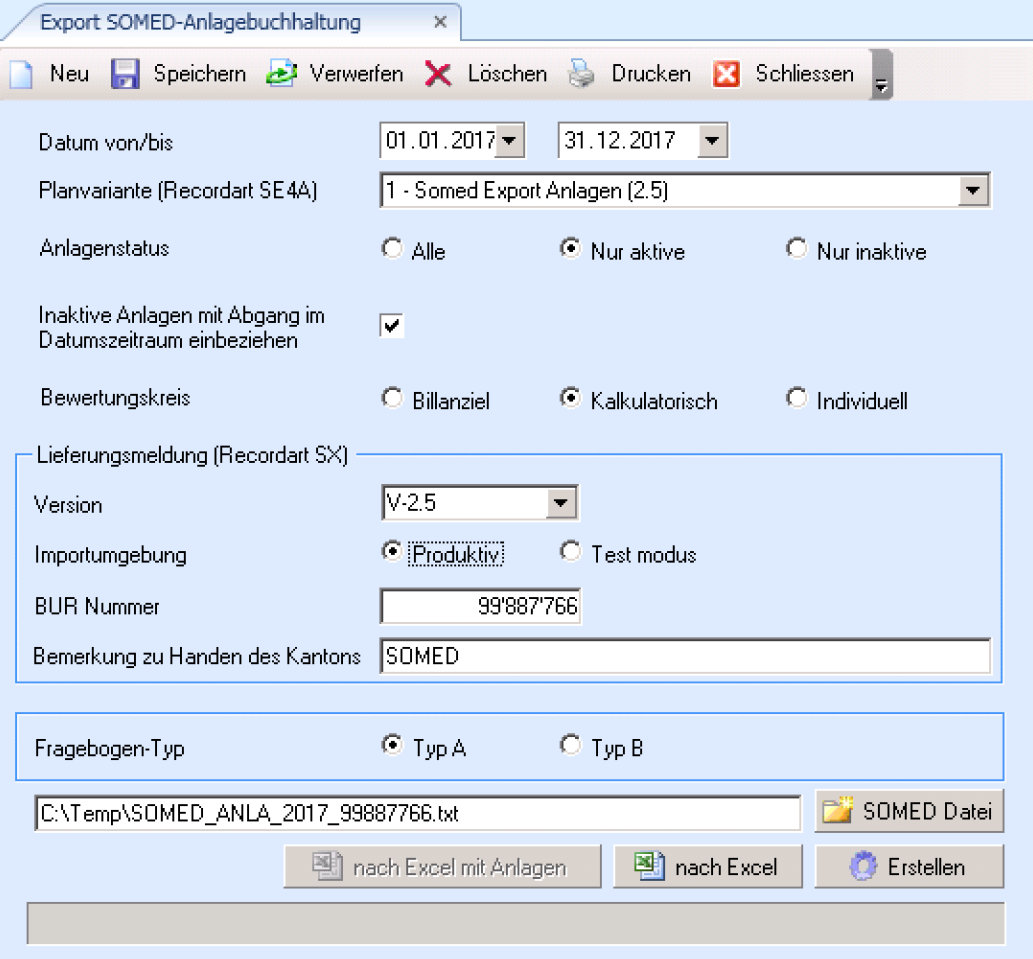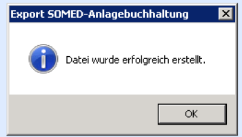- Durch Anwahl des Buttons «Erstellen» werden die SOMED-Anlagenbuchhaltungsdaten in die Datei geschrieben, welche danach in SOMED importiert werden kann.
