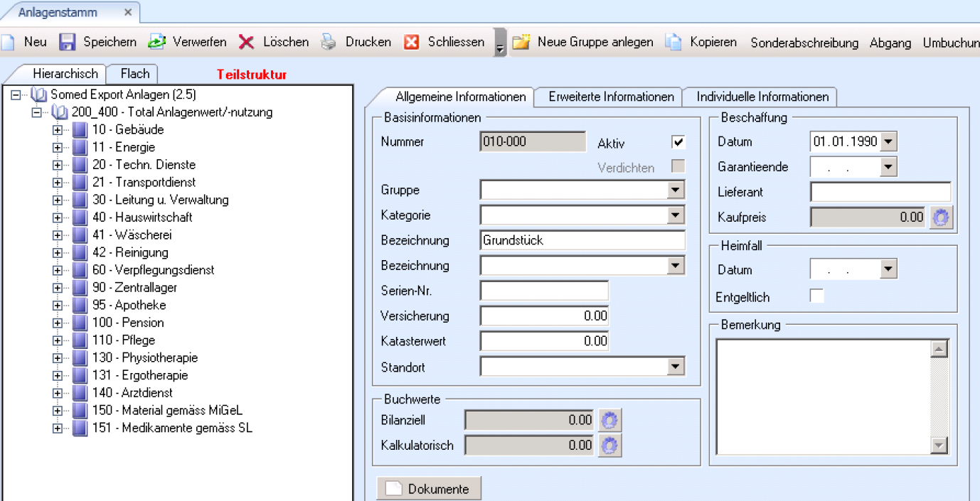 Mit der Export-Funktion SOMED Anlagenbuchhaltung können die Daten aus heim.NET in eine Datei geschrieben werden, welche in der SOMED direkt eingelesen werden kann. Dadurch erübrigt sich die manuelle Erfassung der Daten in der SOMED. Sofern die Einrichtungs-Arbeiten vollzogen sind, können die Daten mit je einer Exportfunktion aus der Anlagenbuchhaltung in eine Datei geschrieben werden. Diese Datei wird dann mittels Import-Funktion in der SOMED (via Internet) eingelesen.