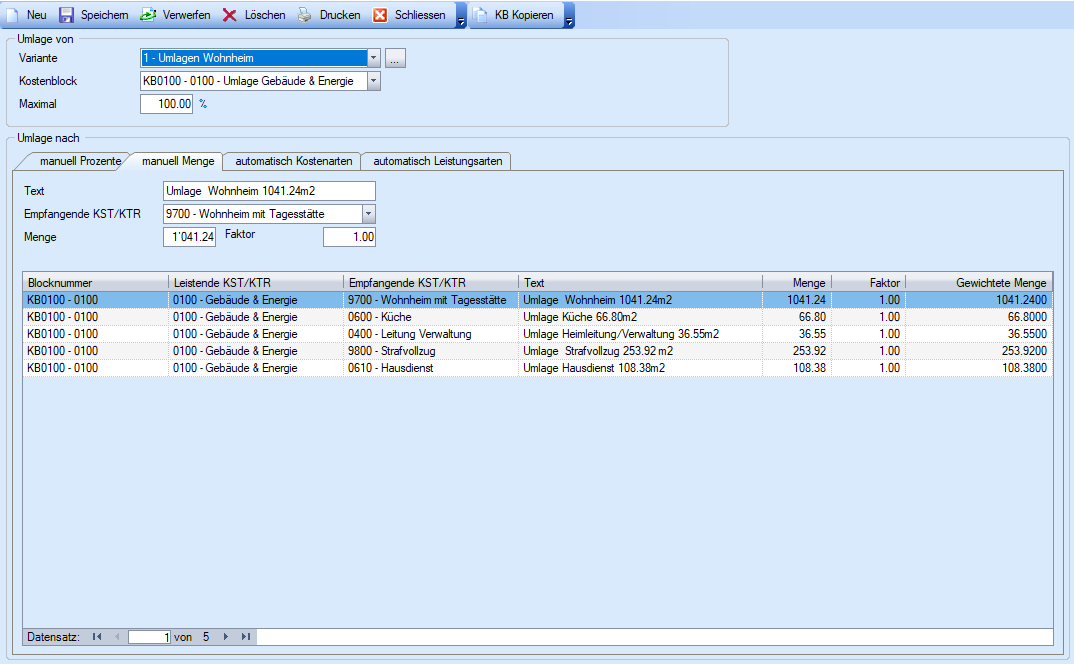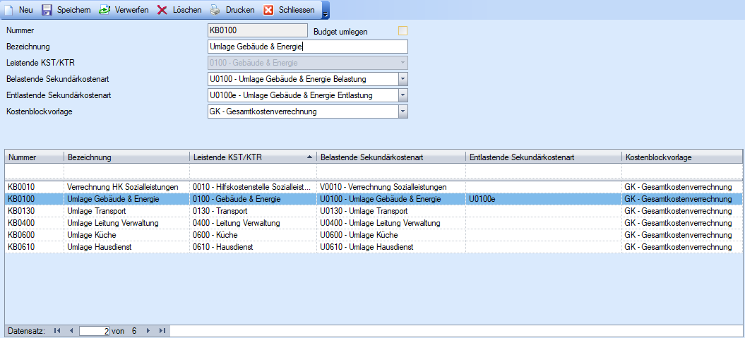 Hinweis: Im Leistenden Kostenblock wird nicht definiert, wohin die Kosten verrechnet werden. Das wird über den Umlagestamm und Verrechnungsstamm definiert.
