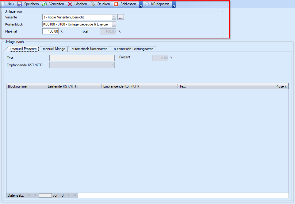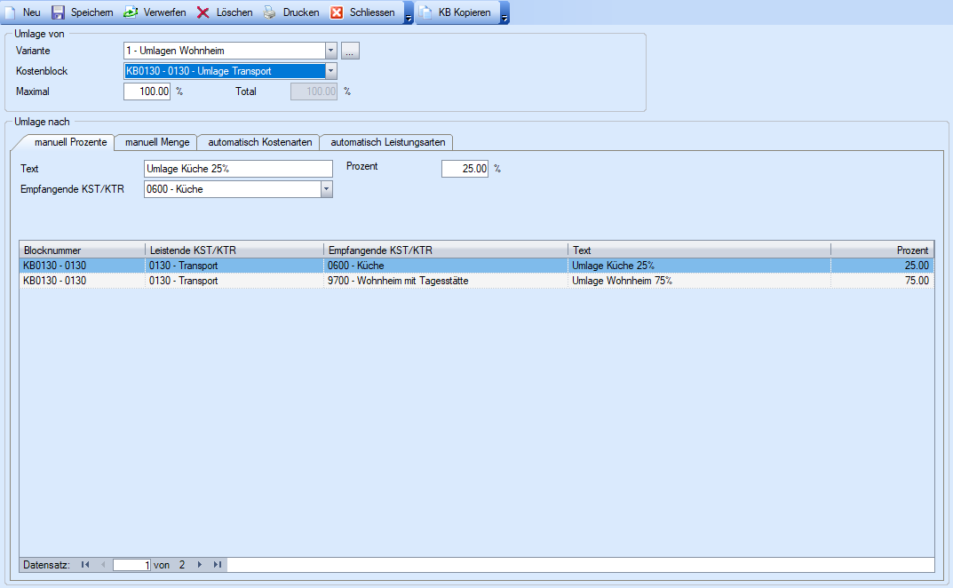 Prozent | Prozentsatz, der Kosten des Kostenblocks, die ab der leistender Kostenstelle berechnet und auf die angegebene empfangende KST/KTR verrechnet werden sollen. |