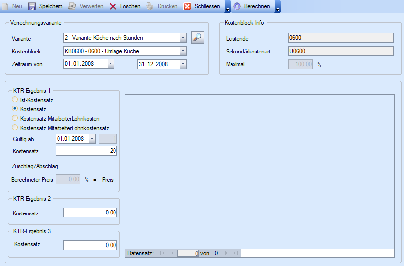 Ist-Kostensatz | Variable Kostensätze ,die auf Grund der bereits gebuchten Kosten auf den Kostenarten des gewählten Kostenblocks verhältnismässig automatisch berechnet werden. Die automatisch berechneten Kostensätze werden dann mit der Menge multipliziert. |