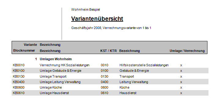 Die Variantenübersicht zeigt, welche Kostenblöcke die Varianten beinhalten und ob ein Kostenblock als Umlage- oder Verrechnungsstamm für die Verrechnung angelegt wurde.