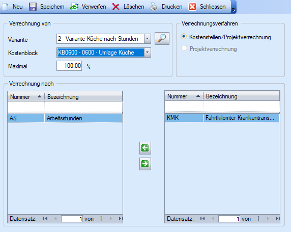 Variante | Wahl der Variante, in welcher sich der Kostenblock befindet, der über die Verrechnungsart Verrechnung verrechnet werden soll. |