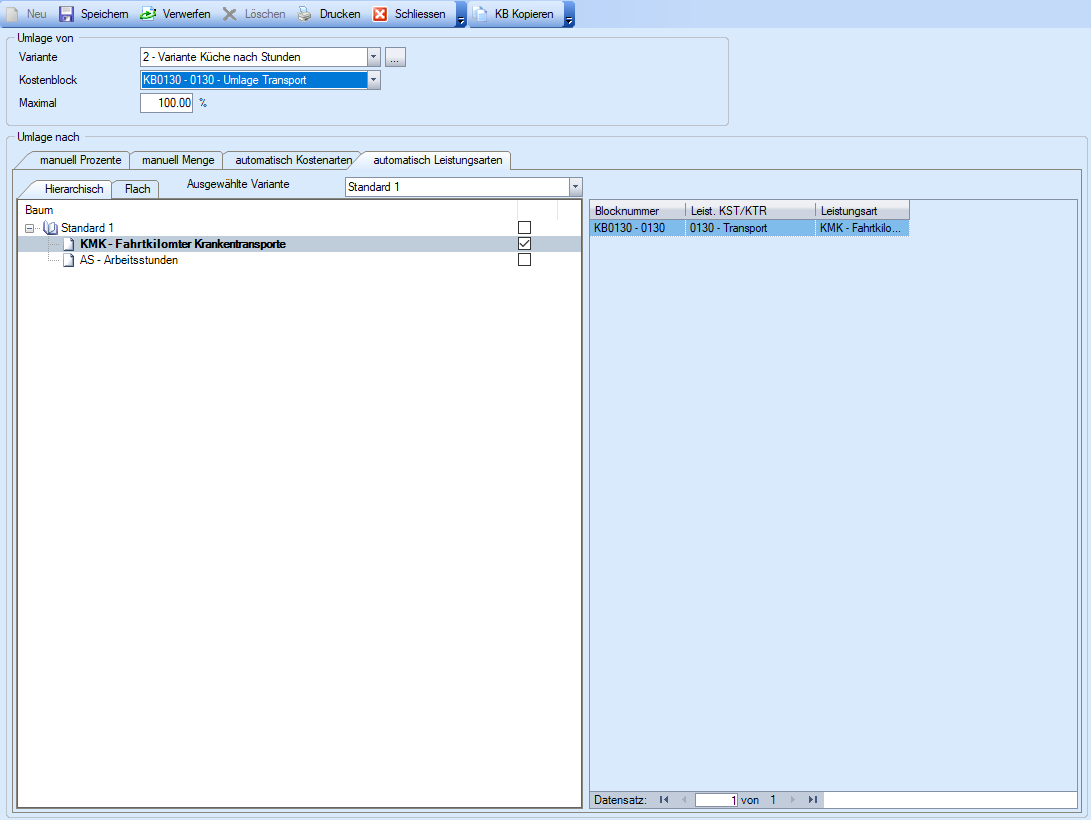 Hierarchisch / Flach | Hierarchische oder Flache Auflistung der Leistungsarten, die in der gewählten Leistungsartenplan-Variante enthalten sind. Die Leistungsarten können über die Checkboxen für die prozentuale Berechnung der Umlage ausgewählt werden. |