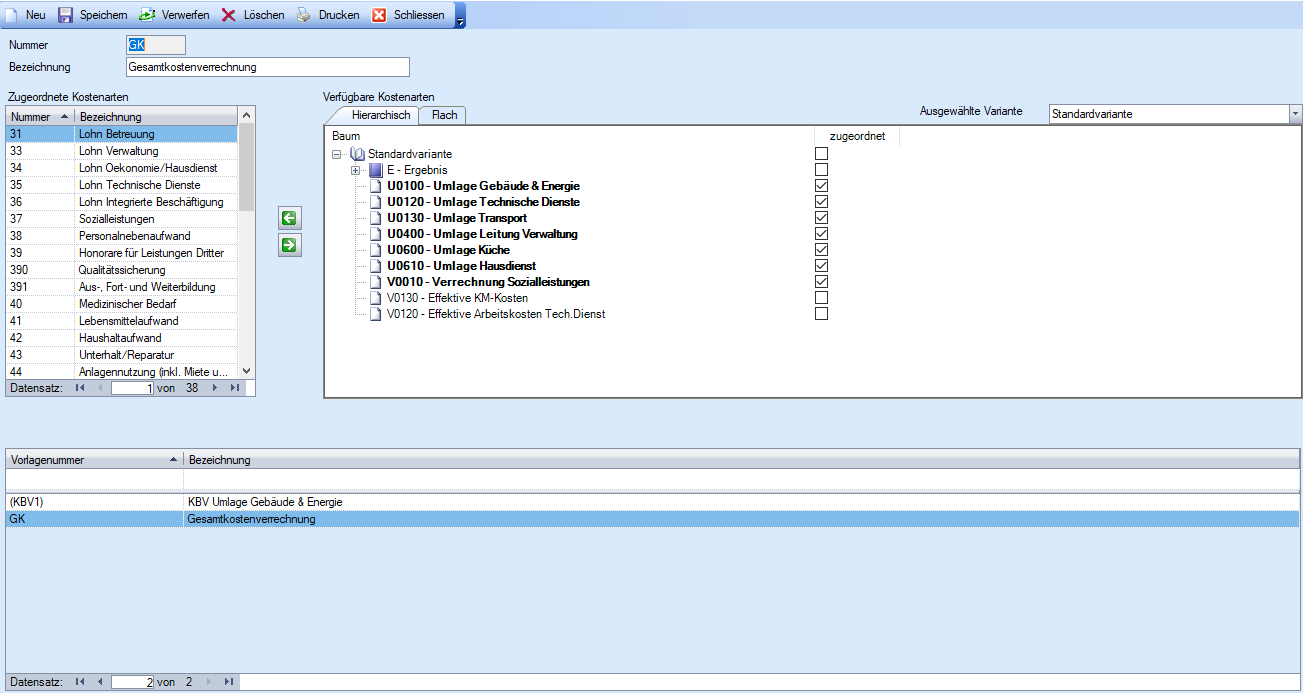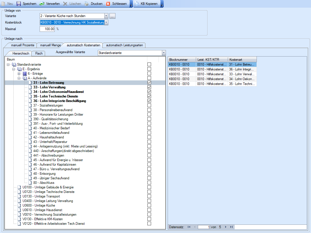 Rechtes Grid | Auflistung aller Kostenarten, die in der links stehenden Kostenartenplan-Variante mit Hilfe der Checkboxen für die prozentuale Berechnung der Umlage ausgewählt wurden. |