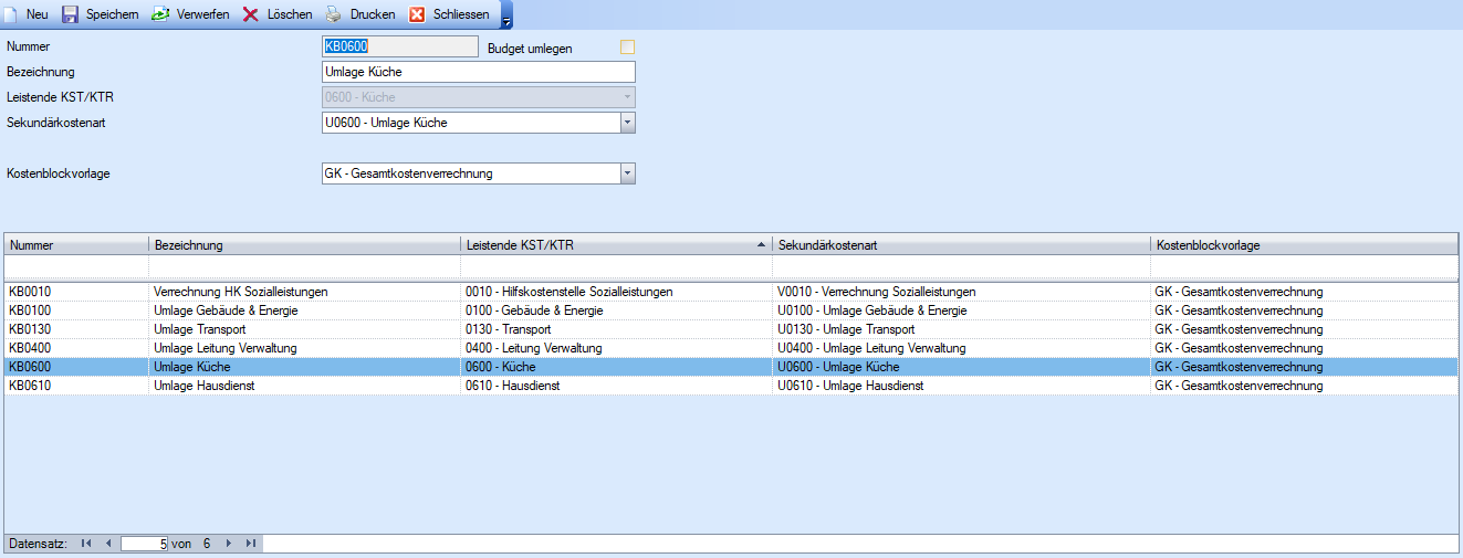 Nummer | Nummer des leistenden Kostenblocks Hinweis: Da ein Kostenblock i.d.R. immer eine leistende Kostenstelle repräsentiert, wird empfohlen, dass die Kostenstellen-Nummer in der Kostenblocknummern enthalten ist. Dies vereinfacht die Transparenz und Übersichtlichkeit beim Aufbau und Unterhalt der darauf aufbauenden Umlage- und Verrechnungstammdaten. |