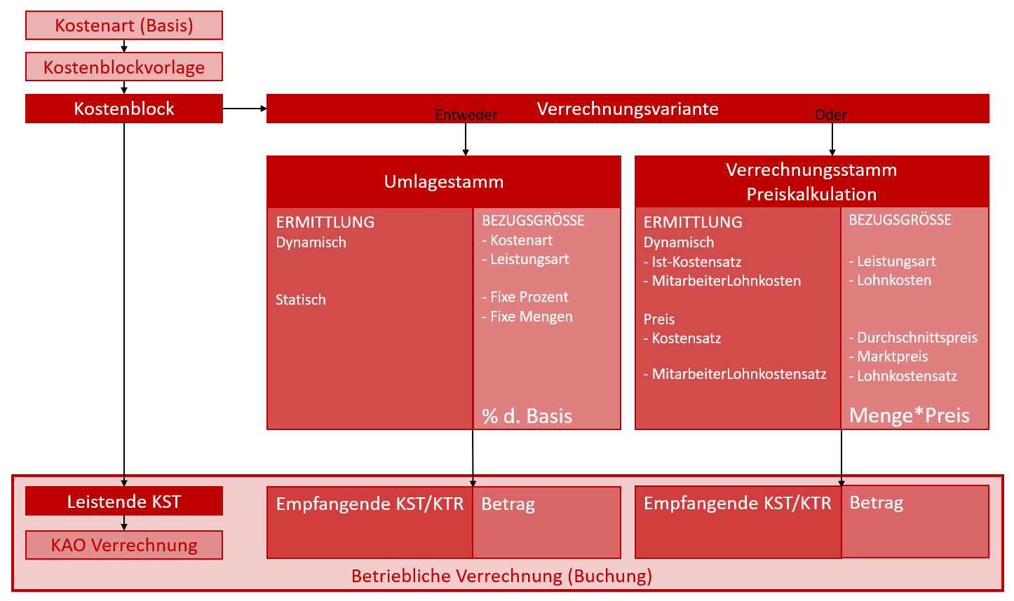 Der Umlagestamm dient dazu, einem Kostenblock über die Zuordnung zu einer Verrechnungsvariante festzulegen, wohin die Kosten des Kostenblocks mittels einem prozentualen Verteilschlüssel verrechnet werden. Die prozentualen Verteilschlüssen können entweder fix (manuell Prozente oder Manuell Menge) oder dynamisch (automatisch Kostenarten oder automatisch Leistungsarten) definiert werden.