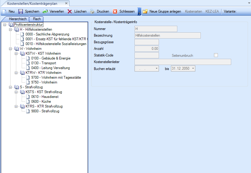 Hierarchisch / Flach | Hierarchische oder Flache Auflistung der Kostenarten, die in der gewählten Kostenartenplan-Variante enthalten sind. Die Kostenarten können über die Checkboxen für die prozentuale Berechnung der Umlage ausgewählt werden. |