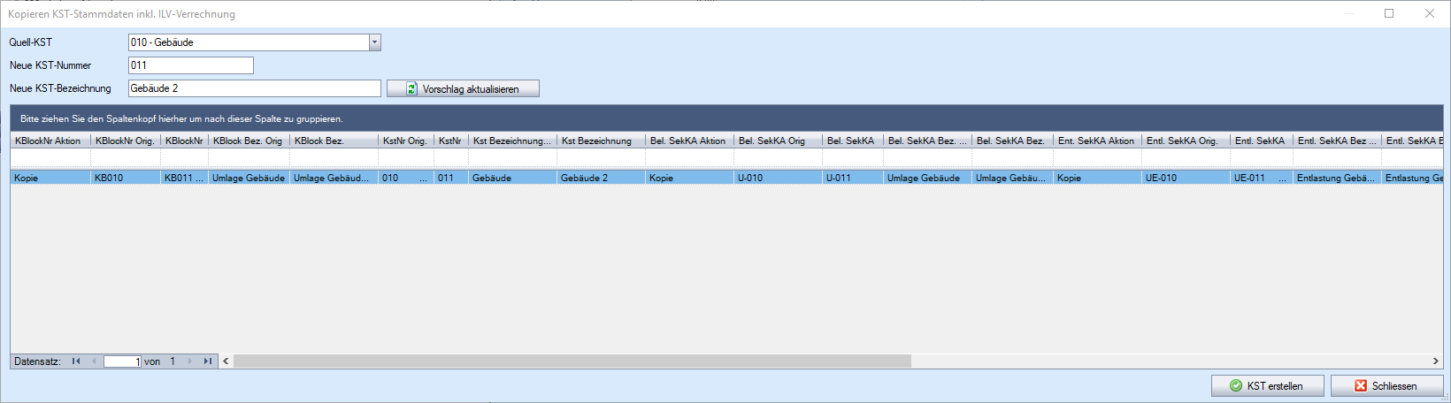 Mit [Kopieren Stammdaten] kann die markierte Kostenstelle im KST-/KTR-Plan kopiert werden. Möchte die Kostenstelle inkl. aller Stammdaten, welche mit der ILV-Verrechnung in Verbindung stehen kopiert werden, kann dies mit [Kopieren Stammdaten inkl. ILV-Verrechnung] getätigt werden. Wird die Kostenstelle inkl. ILV-Verrechnung kopiert, öffnet sich ein Fenster, welches zuerst den Kopie-Vorschlag in einem Grid anzeigt: