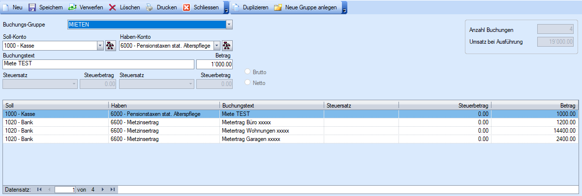 Buchungs-Gruppe | Gruppen-Name der Standardbuchungen. Mit diesen Namen können die Buchungen später abgerufen und ins Hauptjournal verbucht werden. Siehe Buchen Finanzbuchhaltung → Periodische Buchungen |