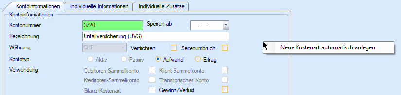 Hinweis: Über das Kontextmenü (rechter Mausklick im Bereich Kontoinformationen) kann eingestellt werden, ob beim Neuerfassen eines Aufwand oder Ertragskonto automatisch eine Kostenart mit der selben Nummer und Bezeichnung angelegt werden soll. | x (nur für | ||||||