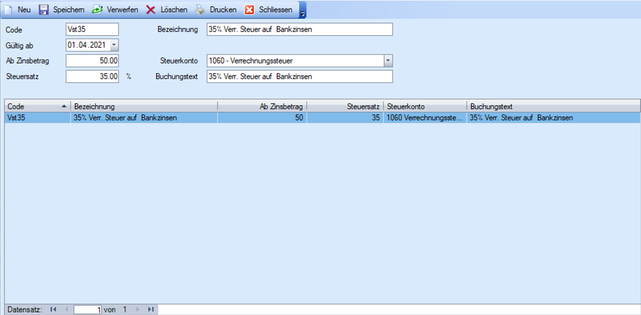 Code | Code (5 Stellen alphanumerisch Hinweis: Verrechnungssteuerpflichtige Zinsen werden im Kontoplan/Schachkonto einem Zinsstamm-Datensatz zugewiesen. (siehe Kontoplan Toolbar) |