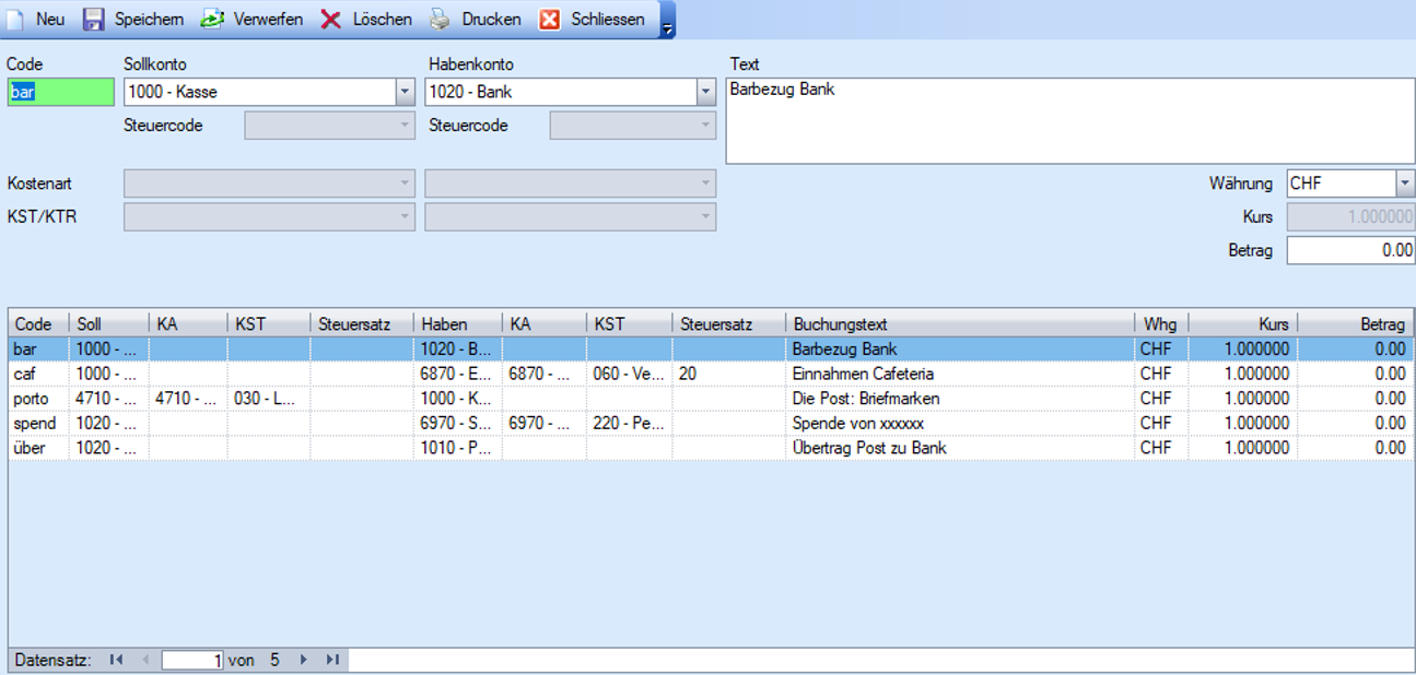 Sollkonto | Mindestens ein Feld muss einen Wert erhalten um den Datensatz als Standardbuchung zu speichern. |