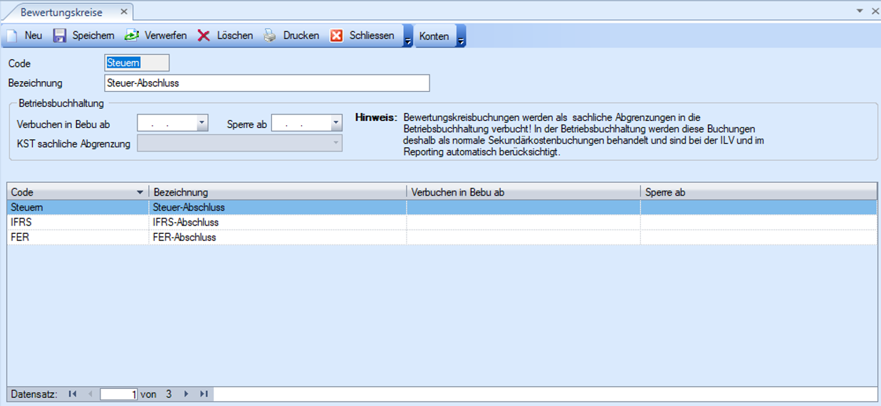 Bewertungskreise werden für die Buchung von Abgrenzungsbuchungen gegenüber dem Hauptjournal genutzt. Wird das Hauptjournal für den handelsrechtlichen Abschluss genutzt und müssen anders bewertete Abschlüsse erstellte werden, z.B. für Steuern, IFRS, SwissGaap, USGaap, oder ähnliches, leisten Bewertungskreise genau das. Bewertungskreisen können so eingestellt werden, dass diese beim Buchen im Hauptjournal direkt bebucht werden können.
