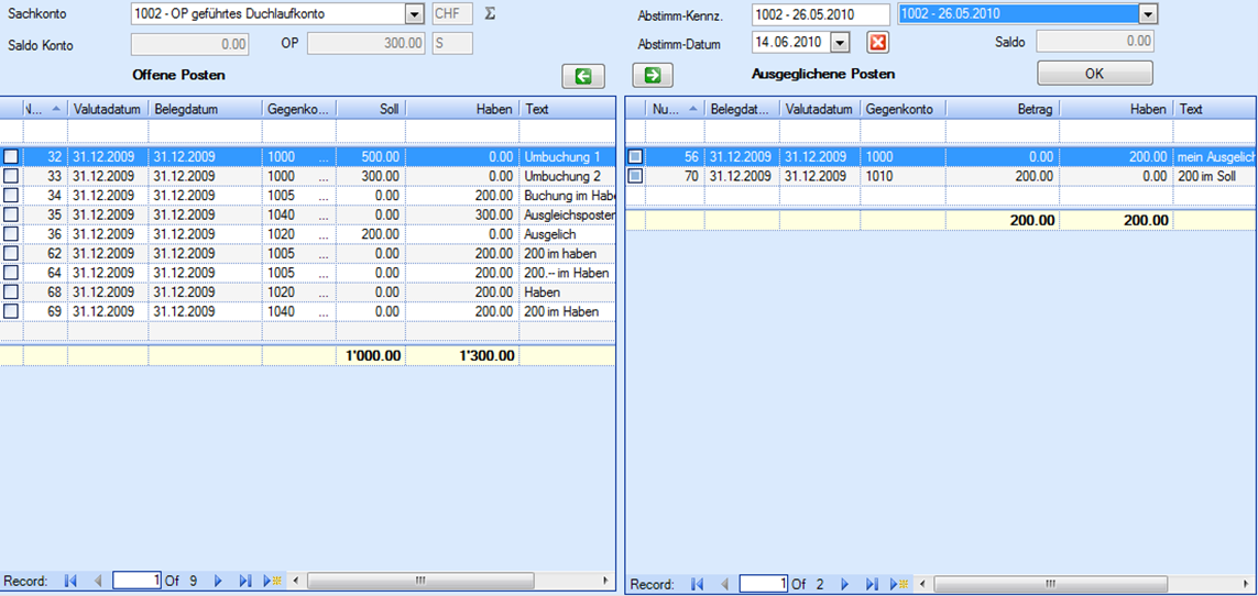 Anlagenkonto Klient-Sammelkonto Transitorisches Konto Gewinn/Verlust OP geführt und muss ausgleichen Über die Schalter [OP geführt] und [muss ausgleichen] wird ein Konto zu einem OP geführten Sachkonto gemacht. Ähnlich einem Sammelkonto eines Hilfsbuches werden auf einem solchen Konto Gruppen von Buchungen zusammengehalten. Häufig wird diese Funktionalität für Abstimmzwecke verwenden. Wird ein so markiertes Konto bebucht, wird dem Benutzer die Möglichkeit der sofortigen Abstimmung geboten. Die Abstimmung kann aber zu jedem beliebigen Zeitpunkt erfolgen. Es existieren unter Finanzbuchhaltung/Auswertung/Journale spezielle Auswertungen für solche Konten: