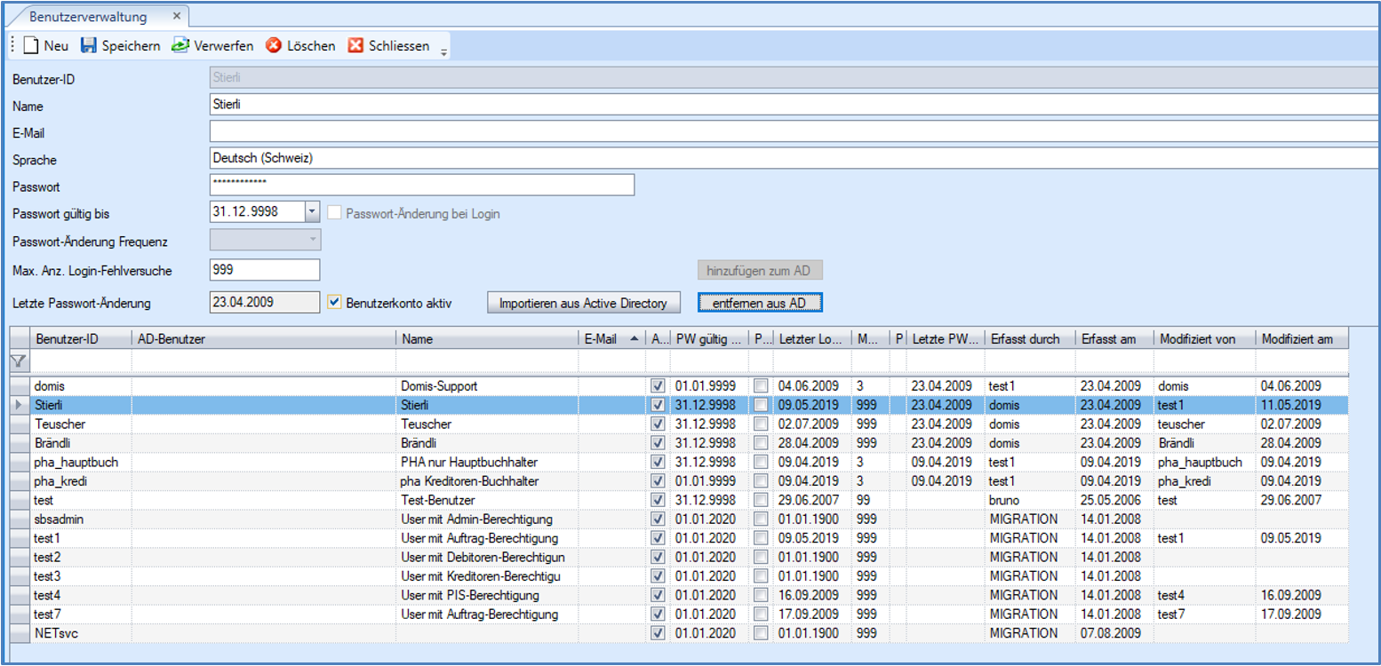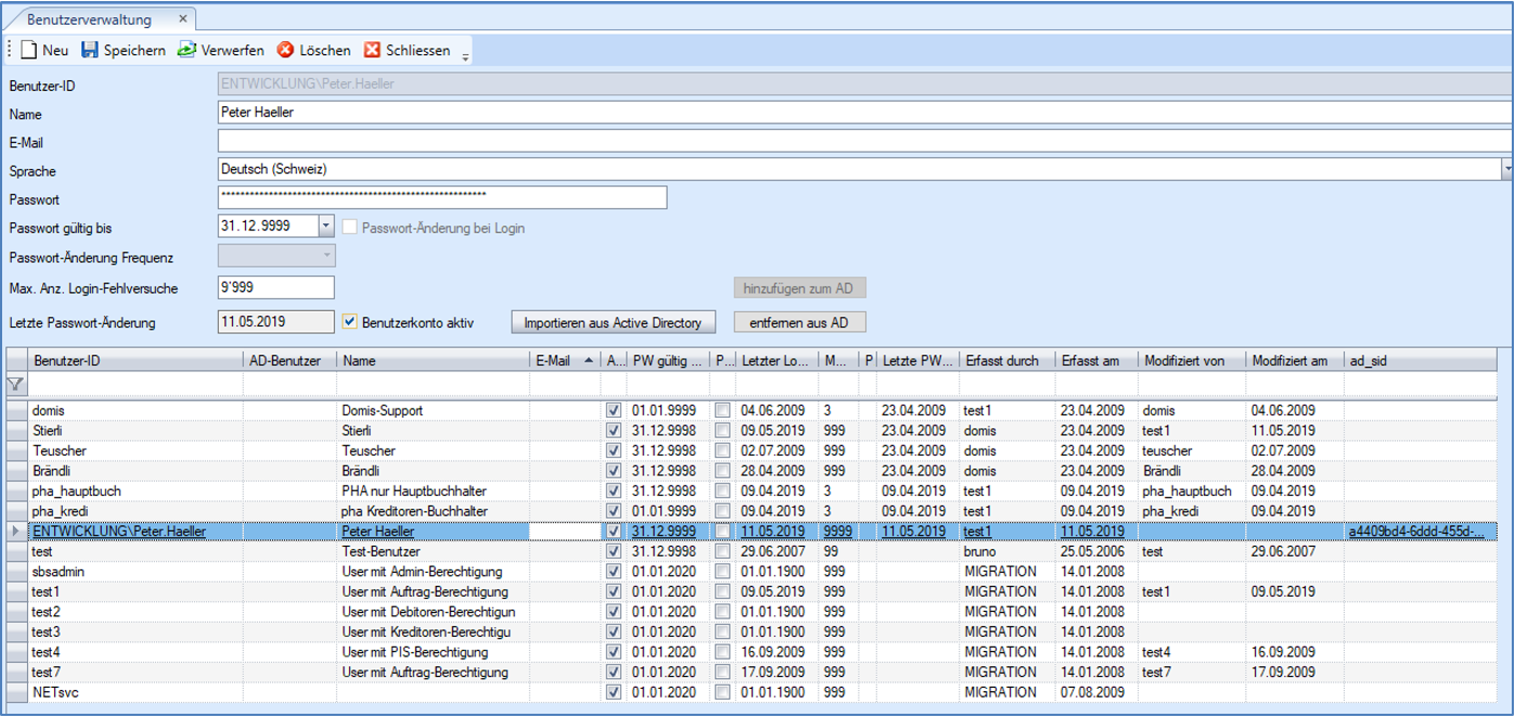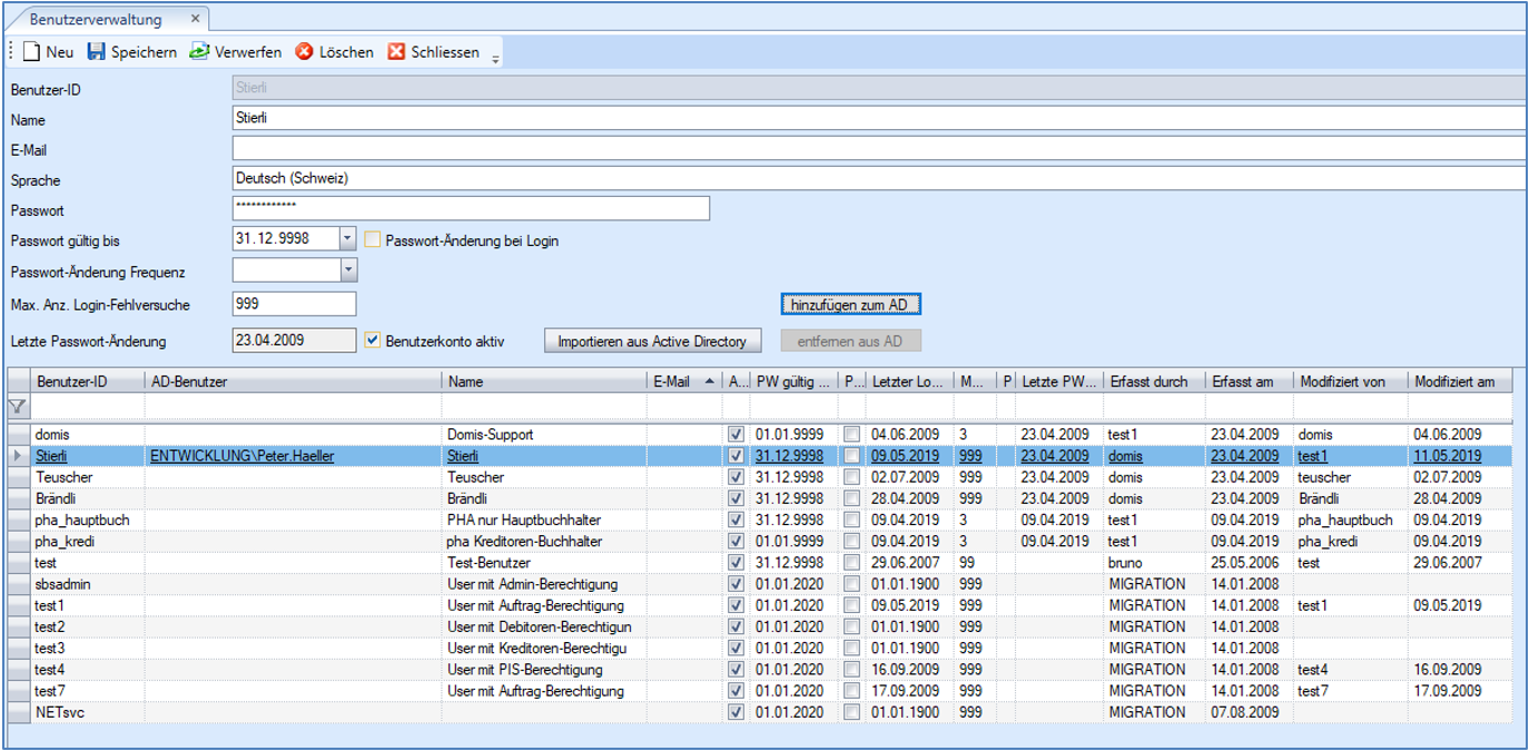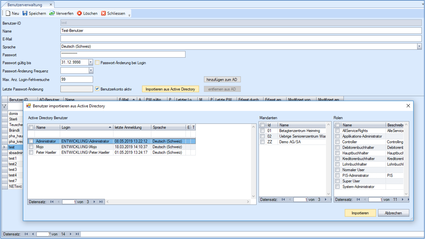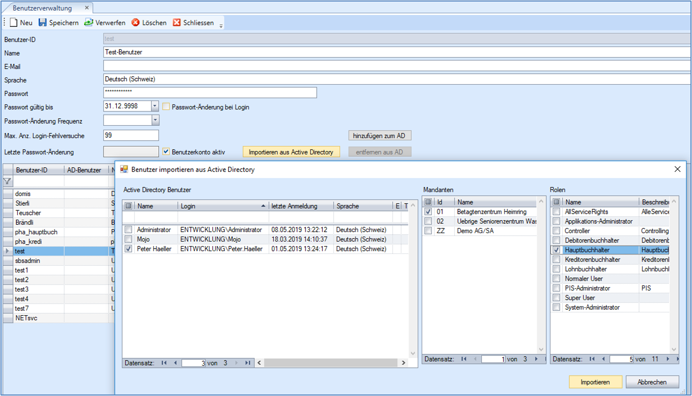 Mittels Importieren wird für die selektierten Benutzer je ein neuer .NET-Applikationsbenutzer angelegt.