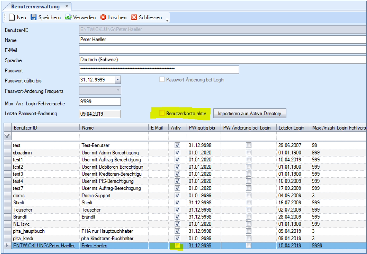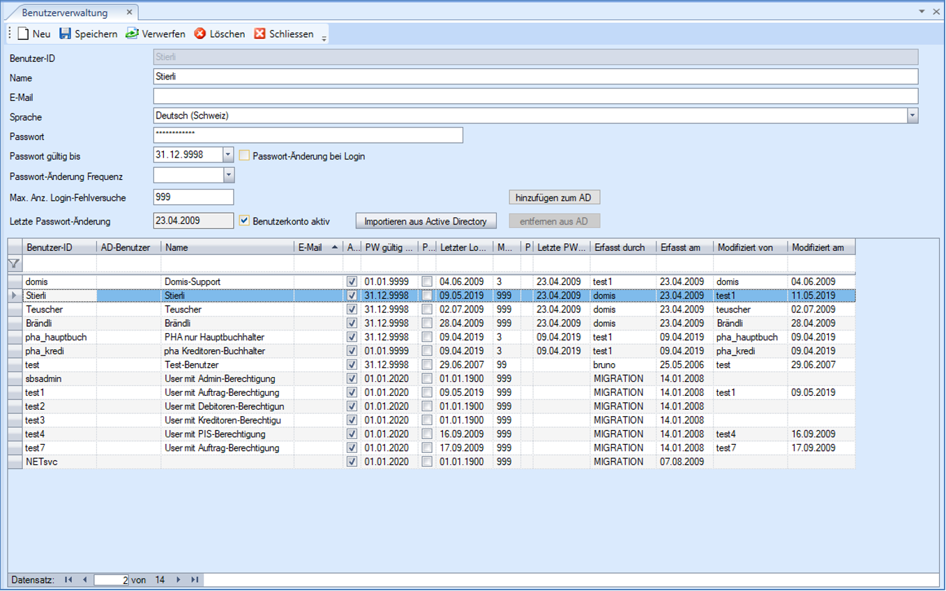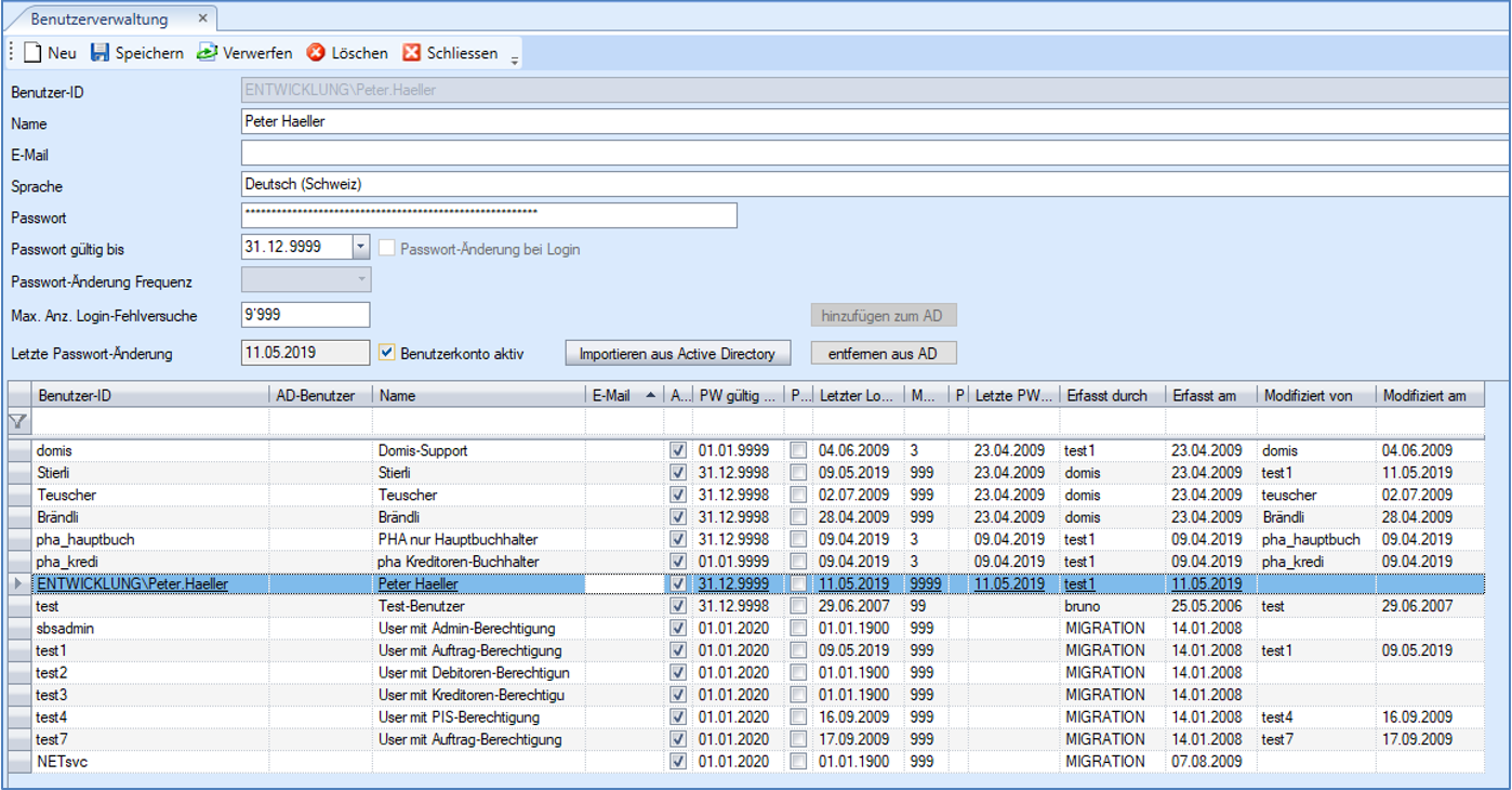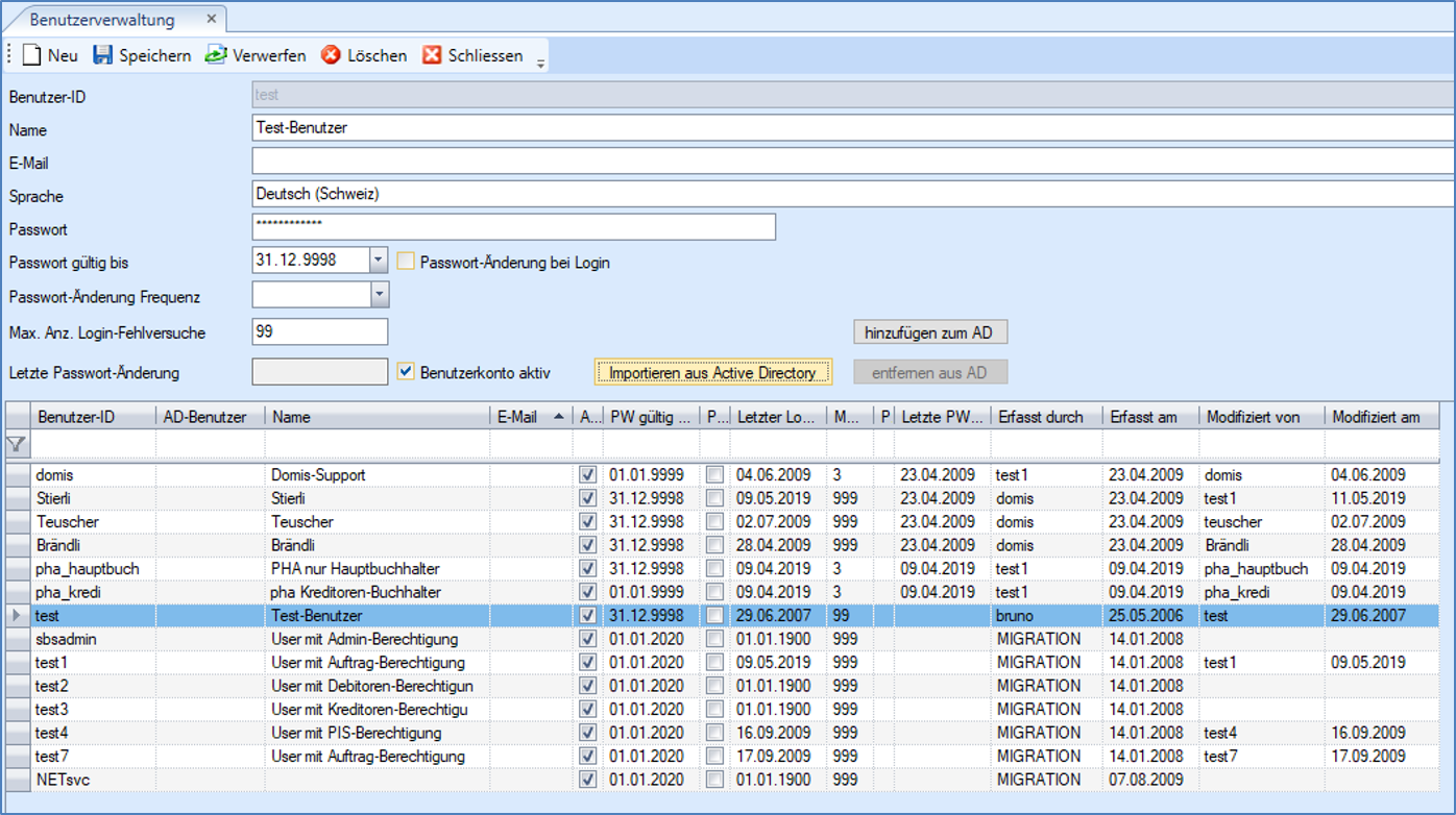 Mittels Importieren wird für die selektierten Benutzer je ein neuer .NET-Applikationsbenutzer angelegt.