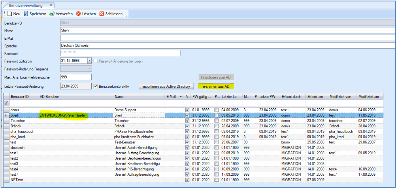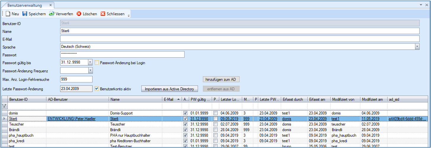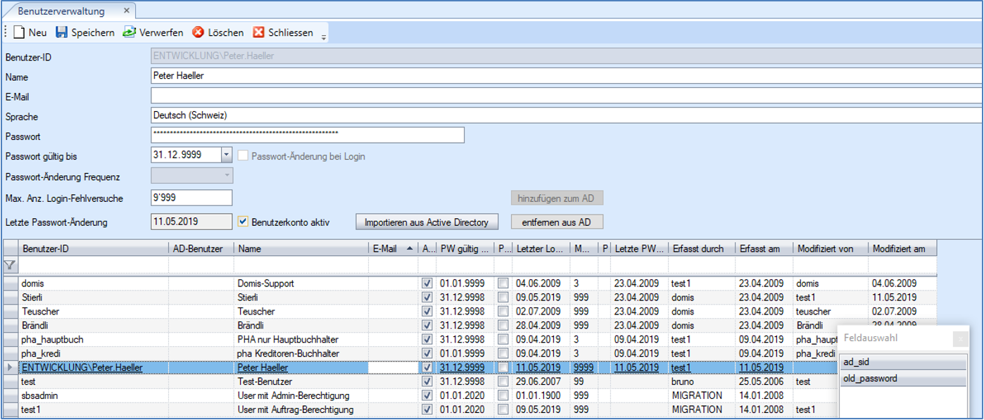 Grid-Spalte ad_sid | Diese Spalte ist Standardmässig nicht sichtbar. Sie kann bei Bedarf über die Kontextmenu-Funktion Feldauswahl zum Grid zugefügt werden. Sie zeigt die AktiveDirectory-Systemid, welche der zugeordnet AD-Benutzer hat. |