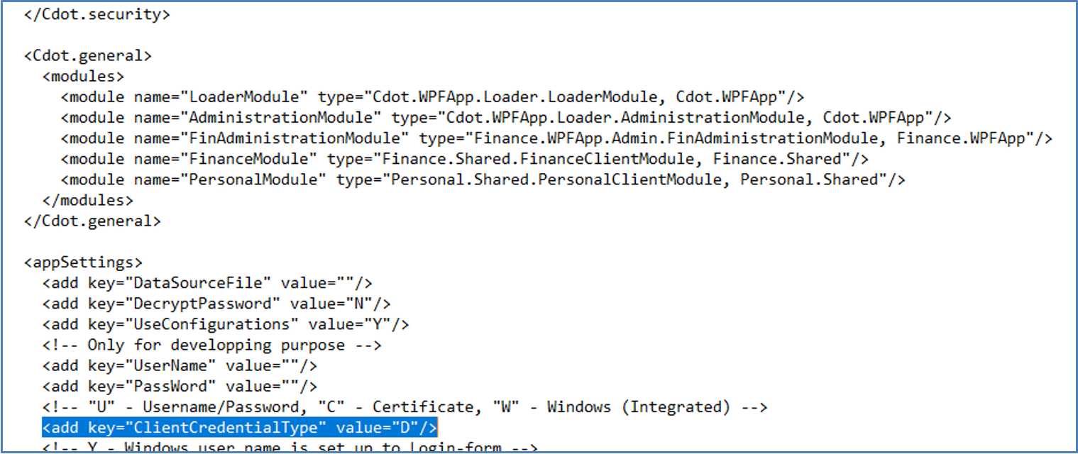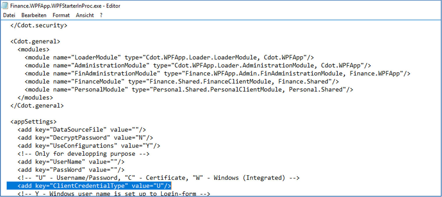 Den ClientCredentialTyp in der .NET-Applikation muss in der entsprechenden Applikationskonfiguration auf AD-Credentials umstellt werden.