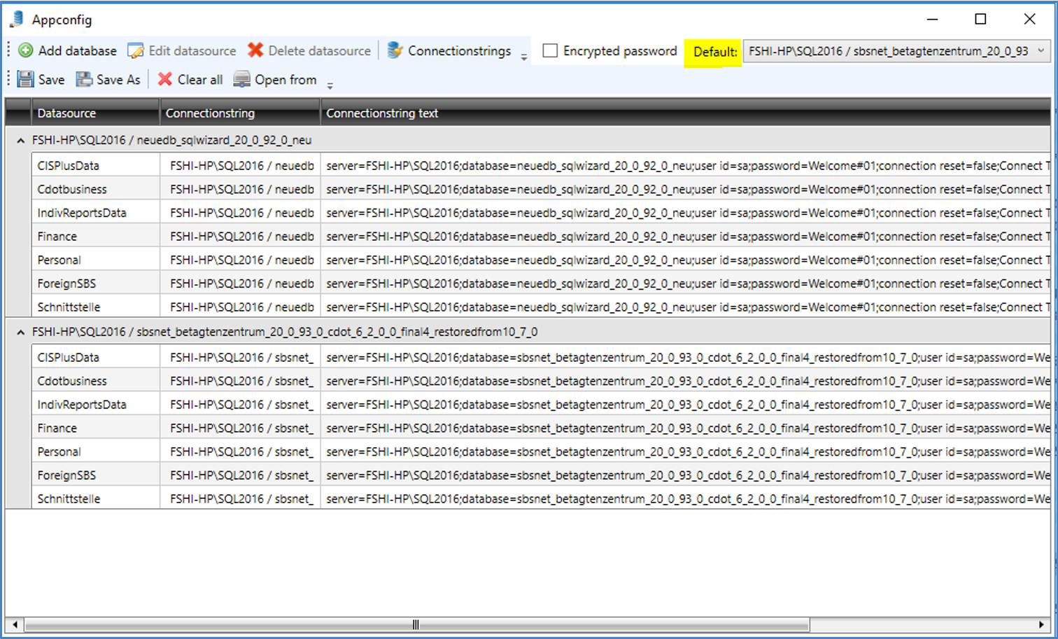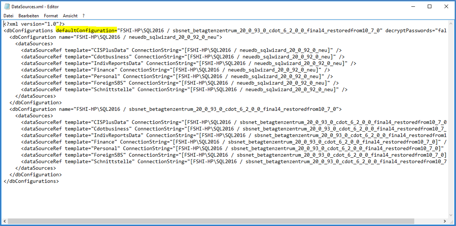 Falls mehr als eine Datenbankkonfiguration in der entsprechenden Datei DataSources.xml definiert sind, wird beim AD-Autologin automatisch die sogenannte Default-Configuration zur Anmeldung verwendet. Soll also ein Client auf einer spezifischen Datenbank mit AD-Autologin anmelden, dann muss die Default-Configuration in der Datei DataSources.xml des entsprechend angepasst werden.