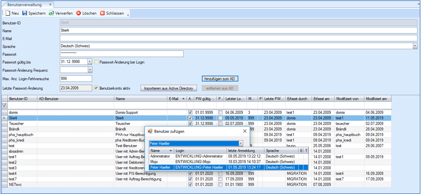 Beispiel gemappter AD-Benutzer ENTWICKLUNG/Peter.Häller auf .NET-Applikation-Benutzer Stierli