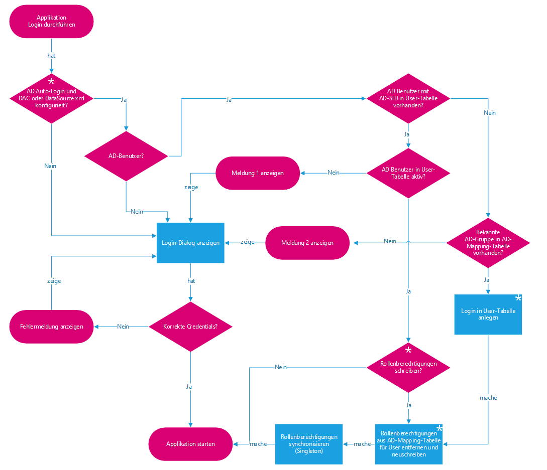 Nachfolgende Grafik zeigt die Abläufe bei einer Benutzeranmeldung über ActiveDirectory SingleSignOn. Die mit einem Stern gekennzeichneten Darstellungssymbole sind Funktionalitäten, welche ganz oder teilweise über Konfigurationsparameter beeinflussbar sind.