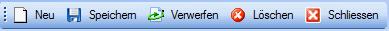 Unterhalb der Menüleiste, ist die Symbolleiste mit den Buttons für Neu, Speichern, Löschen usw. angeordnet. Diese kann sich bei Bedarf der einzelnen Funktionen anpassen und können daher zum Teil auch inaktiv sein.
