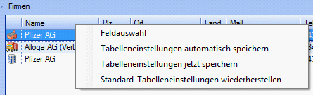 - Soll die Mutation beibehalten werden, muss über das Kontextmenü (rechter Mausklick) die Speicherfunktion ausgewählt werden. Hier am Beispiel Register Firmen: