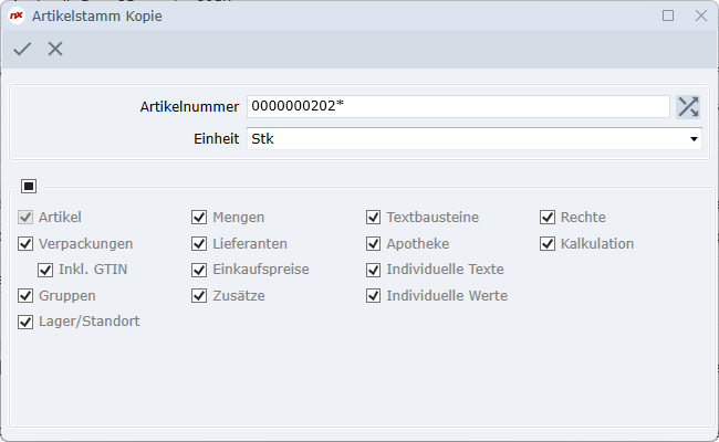Die zu kopierenden Eigenschaften pro Register des Artikelstammes, können mit dem Kontrollkästchen aktiviert oder deaktiviert werden.