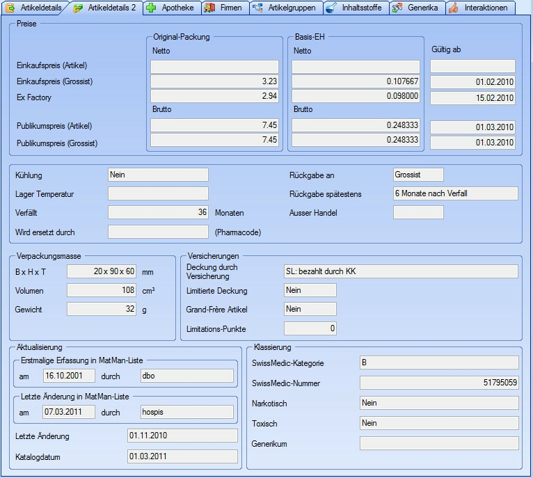 Einkaufspreis (Grossist) | Anzeige des EK-Preises (Grossist), sofern vorhanden, in Original-Packung und Basiseinheit inkl. Gültig-Ab-Datum. Siehe auch Kapitel Preise |