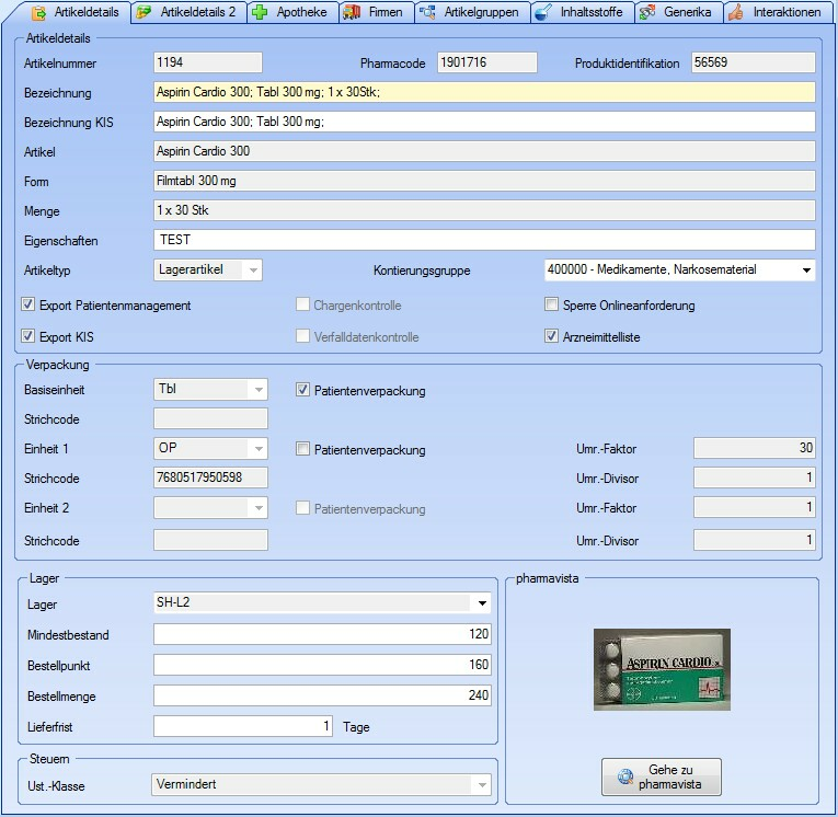 Pharmavista | Anzeige Bild, wenn vorhanden und Internetzugriff existiert (Anzeige kann unter >Extras >Einstellungen ausgeschaltet werden) Mit einem Klick auf das Bild, wird dieses vergrössert angezeigt. Siehe unten |