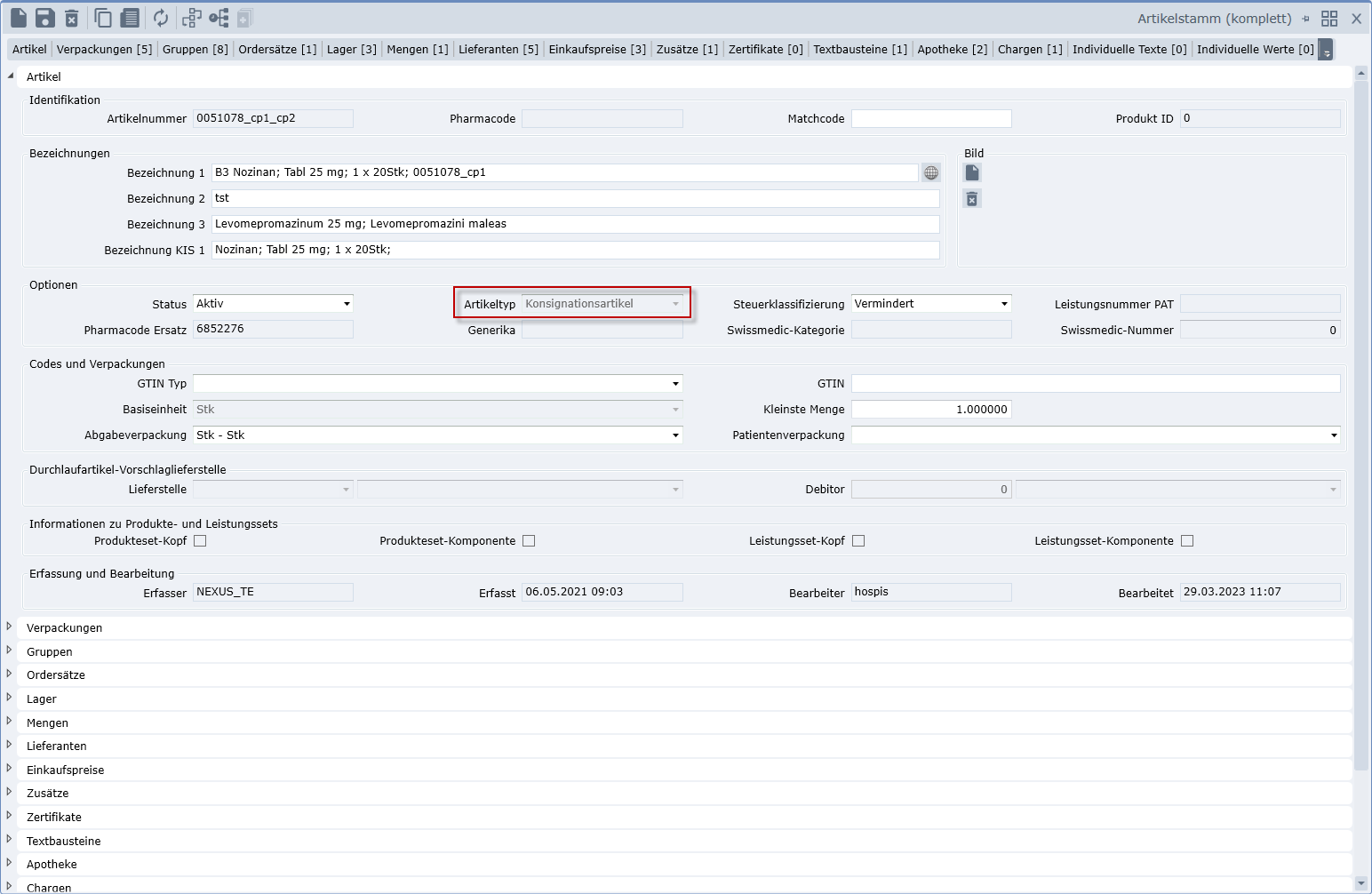 Für Konsignationsartikel können keine Chargen- bzw. Verfalldaten gepflegt werden. Eine allfällige LOT-Nummer für den Lieferanten muss im Abgangsbeleg erfasst werden.