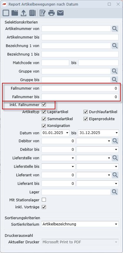 Es kann auch nach einer Fallnummer direkt gesucht werden (Eingabe Fallnummer in den Feldern von/bis).