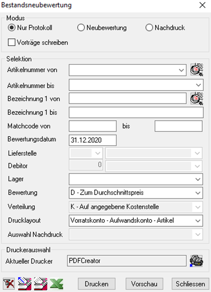 Bewertungsdatum | Stichtag zu wann die Lagerbewertung erfolgen soll. Datum per wann "Neubewertungs"-Belege erstellt werden. |