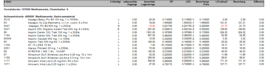 Artikel mit bewertete Lagermenge = 0 | Soll = Lagerwert 0.00 |