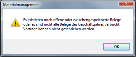 Es können keine Vorträge mehr geschrieben werden, wenn Belege zwischengespeichert, nicht verbucht oder noch nicht übernommen sind. Eine Auswertung «Offene Belege» kann erstellt werden, siehe Kapitel Offene Belege.