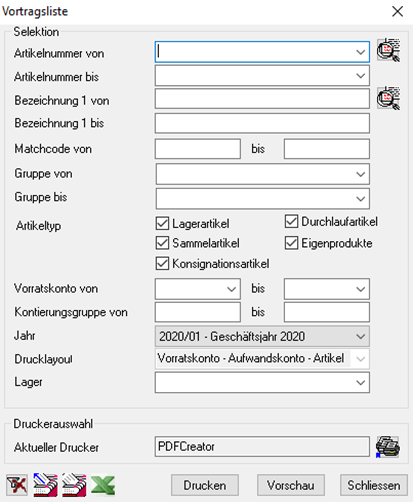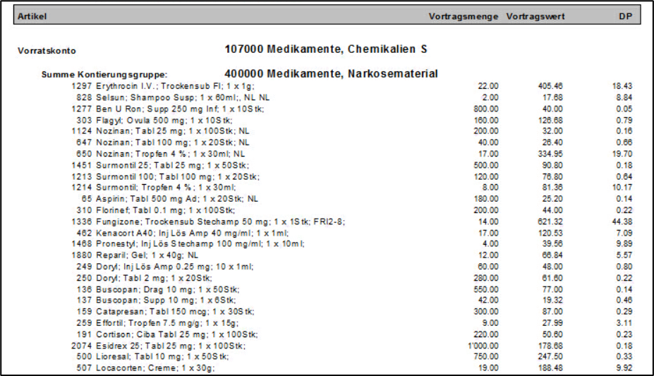 Die Vortragsliste 1x pro Jahr per 01.01. erstellt und gibt pro Artikel die Vortragsmenge, den Vortragswert und den Durchschnittspreis (DP) aus.