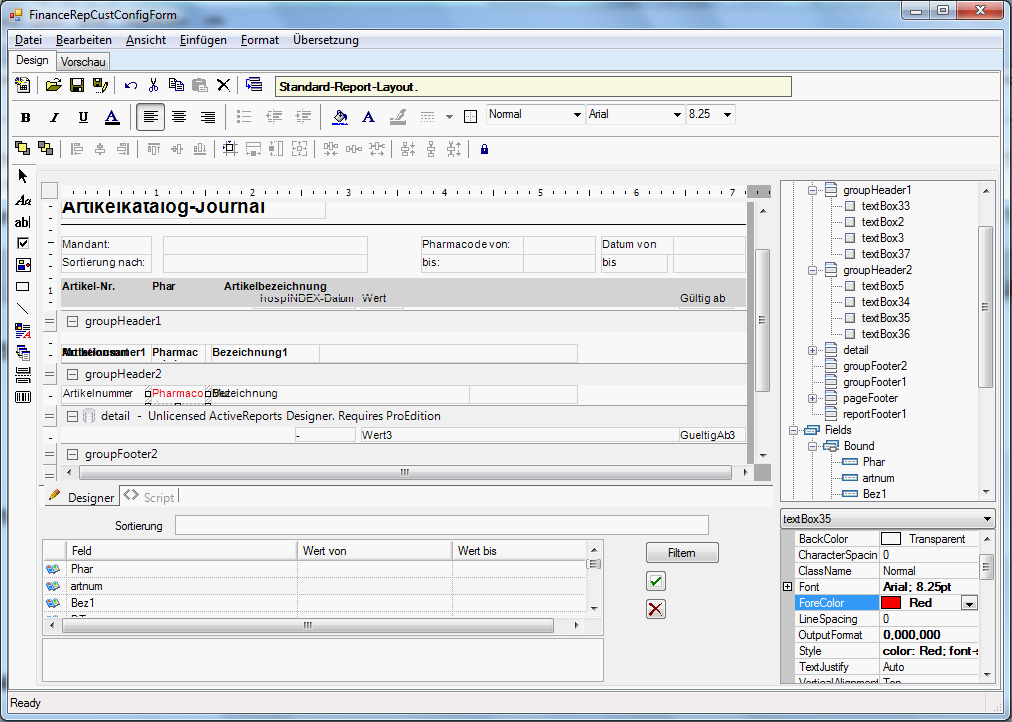 Aufgabe: Anpassung Feld Pharmacode Schriftart rot wählen