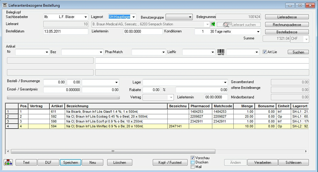 Die Funktionen Vorschau, Drucken und Mail bleiben zusätzlich erhalten, falls dies erforderlich ist. Mit dem "Verarbeiten" erfolgt immer eine Abfrage ob die elektronische Bestellung erzeugt werden soll und wird erst abgeschickt wenn die Meldung bestätigt wird. Zwischengespeicherte Bestellungen werden nicht elektronisch verschickt.