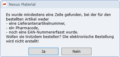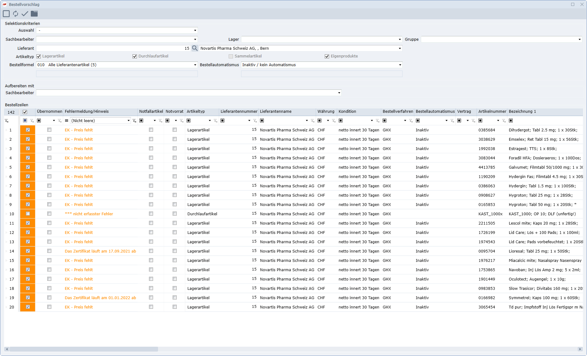 Gleicher Ablauf wie unter "Lieferantenbezogene Bestellung" beschrieben. Unterschied, hier können mehrere Lieferanten enthalten sein, deswegen erfolgt die Zwischenabfrage pro Lieferant; siehe auch Artikelbezogene Bestellung Artikelpositionen die weder Pharmacode, EAN-Code noch eine Lieferanten-Artikelnummer führen (siehe auch Kapitel Artikelstamm), werden nach dem Speichern gelb markiert und mit einer Hinweismeldung versehen. Die Artikel müssen zuerst im Stamm korrigiert werden, sie können nicht im Bestellvorschlag verarbeitet werden.