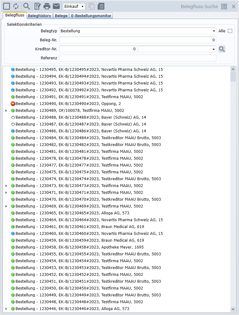 Im Belegfluss kann man ersehen, welche Bestellungen noch nicht elektronisch versandt wurden, diese tragen die Farbe "Blau" anstatt "Grün". Dies gilt nur für Lieferanten, die für dieses Verfahren eingestellt wurden und nur bei "verarbeiteten" Belegen (nicht "zwischen gespeicherte").