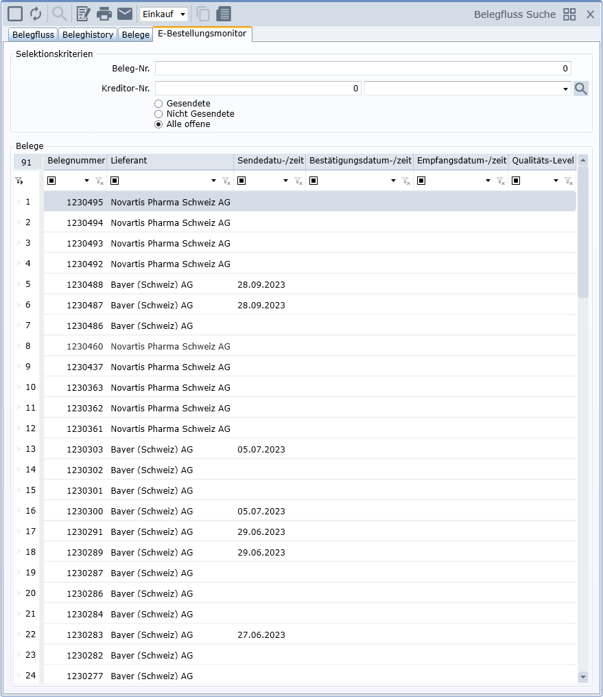 Gesendete | Es werden alle gesendeten ohne Empfangsdatum und ohne Folgebelege angezeigt (nur offene Bestellungen) |