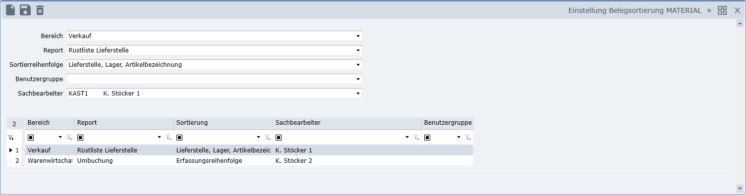 Wenn angelegt, zeigt die Auswahl die zur Verfügung stehenden Benutzergruppen (MAT) an und erlaubt bei Zuordnung eine Benutzergruppen-spezifische Belegsortierung.