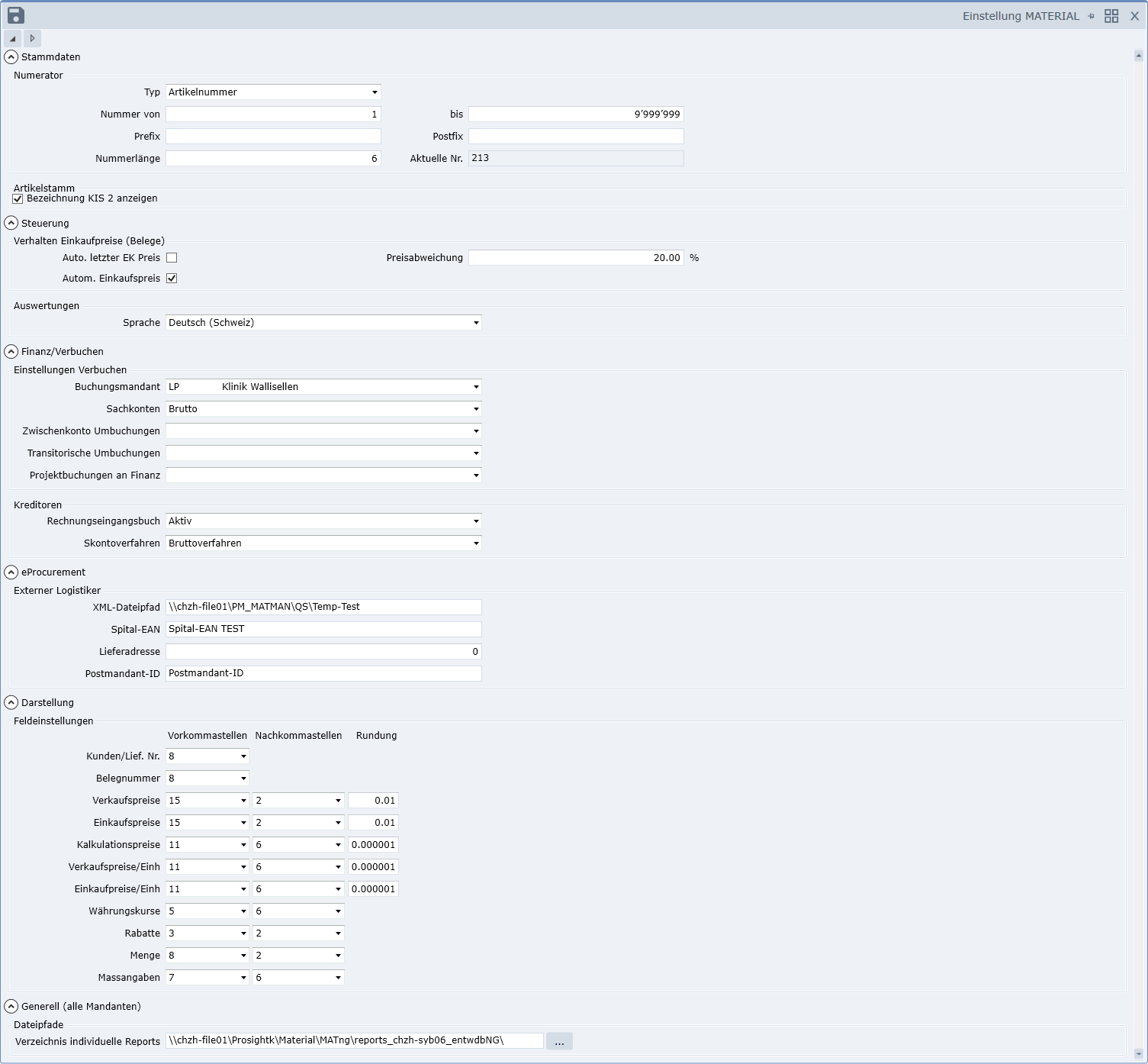 Im Plugin 'Einstellungen MATERIAL' erfolgen mit Projekteinführung die zentralen Grundeinstellungen wie innerhalb der Applikation gearbeitet werden soll und wie die Interaktion mit NEXUS / FINANZ erfolgen soll.