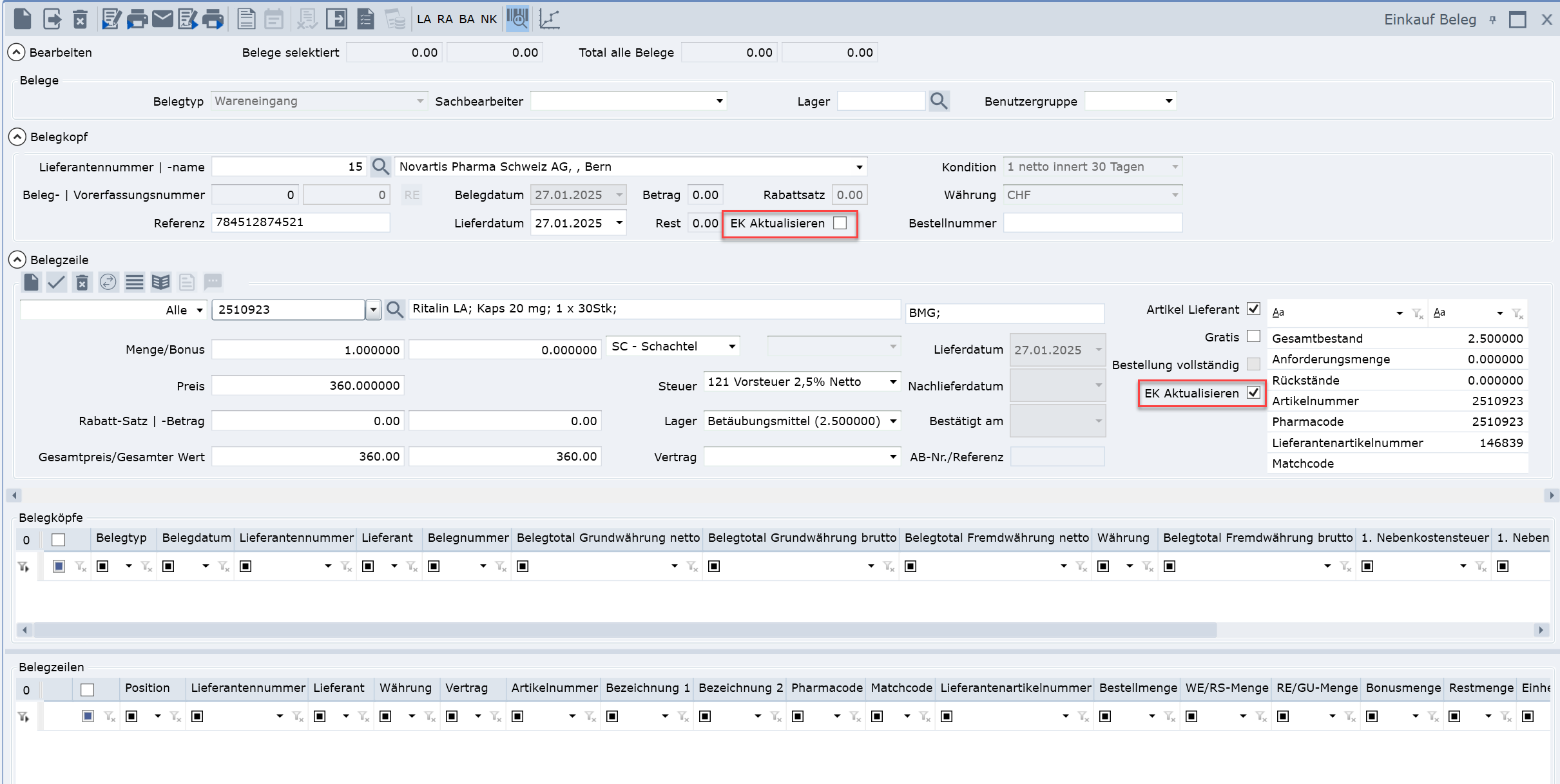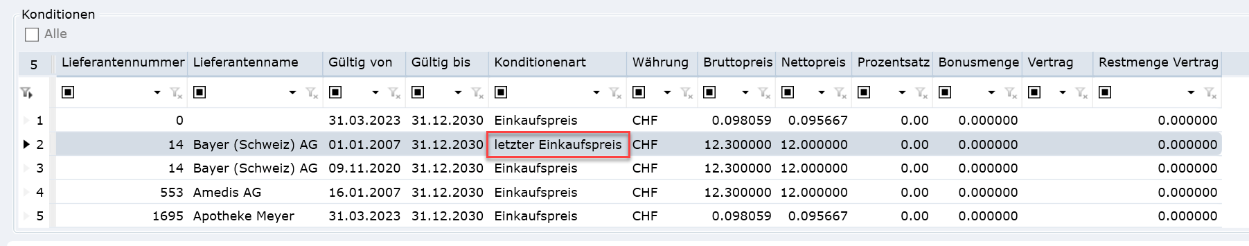 Auto. letzter EK-Preis | Ist die Checkbox aktiviert, so wird mit dem Verarbeiten einer Rechnung über das Plugin 'Einkauf Beleg' im >Artikelstamm >Einkaufspreise ein Konditionssatz mit Preistyp 'Letzter EK-Preis' eingefügt und jeweils aktualisiert. | ||||||||||||||||||||||