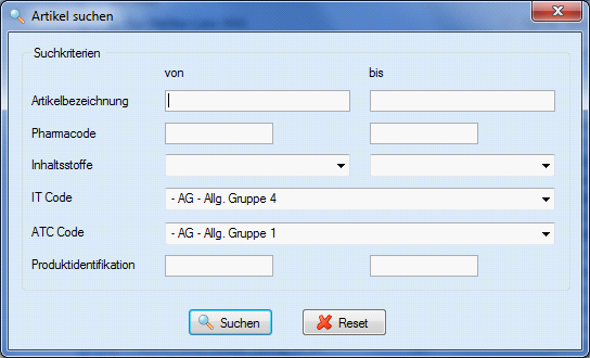 Pharmacode von/bis | Eine Eingabe schränkt die Suche auf die gewählten Artikel ein. |
