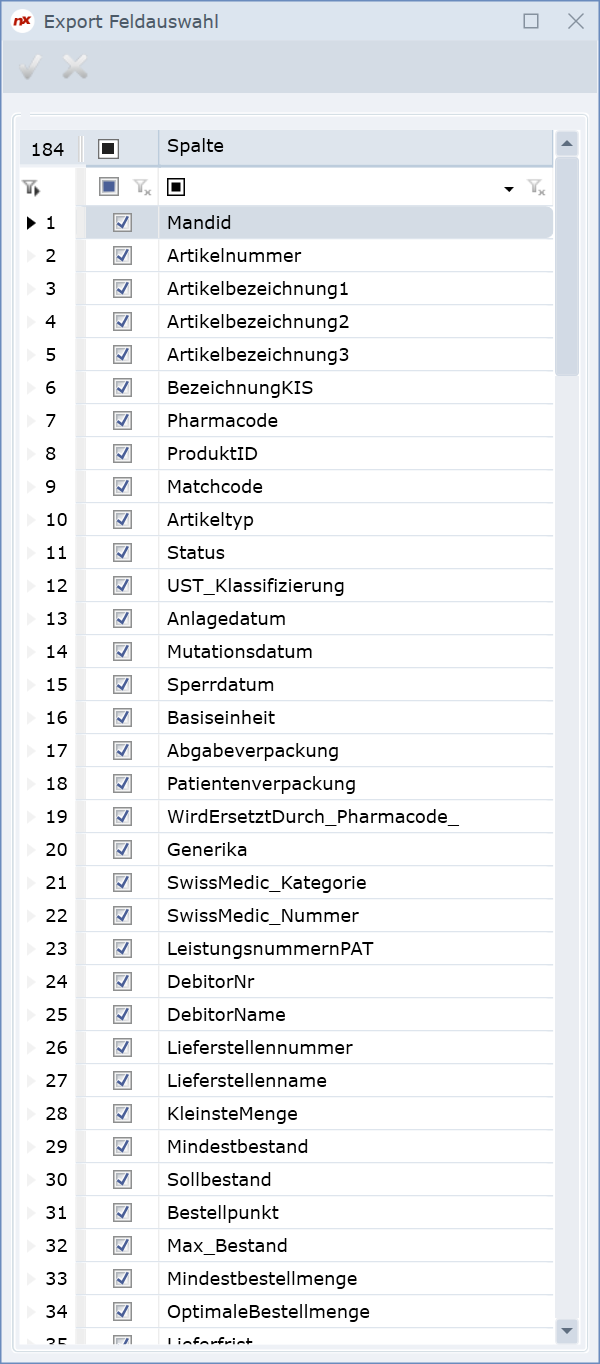 Soll die Export-Liste (Excel) nicht alle Artikelstammfelder beinhalten, kann über die Feldauswahl eine gezielte Auswahl erfolgen